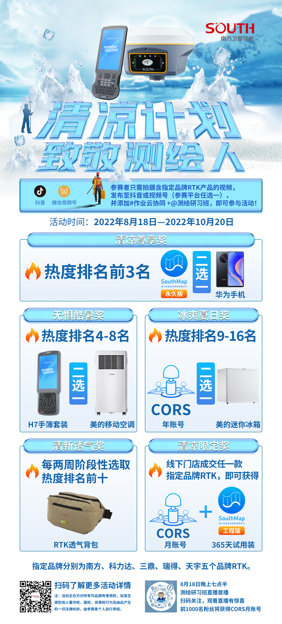 參賽者只需拍攝指定品牌產(chǎn)品的視頻,發(fā)布至抖音或視頻號(參賽平臺任選一),并添加 #作業(yè)云協(xié)同 +@測繪研習(xí)班,即可參與活動!1.本次活動熱度將根據(jù)視頻點贊數(shù)數(shù)量評估,熱度排名由抖音和微信視頻號兩大平臺參賽視頻匯總排名,清涼尊享獎、無懼酷暑獎、冰爽夏日獎三個獎項為活動總熱度排名,清新透氣獎為每兩周階段性熱度排名;2.所有獎項除清新透氣獎外,同一參賽者只可獲得單項獎,如參賽者投稿多個視頻,只以點贊數(shù)最高的單條視頻為準(同一注冊賬號/電話/地址/郵箱等均視為同一參賽者);3.參賽者拍攝作品需為原創(chuàng),出鏡產(chǎn)品為南方、科力達、三鼎、瑞得、天宇五個指定品牌,視頻時長不限,展現(xiàn)測繪日常、測繪場景、測繪人樂觀向上的精神面貌等;4.每兩周在廣州南方衛(wèi)星導(dǎo)航公眾號推文及測繪研習(xí)班抖音直播間公布清新透氣獎,參賽者請密切關(guān)注,獲獎的參賽者可通過添加客服微信(SOUTHKEFU)領(lǐng)取獎品;5.活動嚴禁“刷贊”等弄虛作假行為,一經(jīng)發(fā)現(xiàn)查實,將取消活動參與資格;6.8月18日前,帶#南方云協(xié)同+@測繪研習(xí)班的參賽作品可參與活動熱度排名,自8月19號起,參賽以添加#作業(yè)云協(xié)同+@測繪研習(xí)班為準,否則視為無效作品;7.活動主辦方對所有作品擁有使用權(quán),如發(fā)生侵犯他人著作權(quán)、版權(quán)、肖像權(quán)行為及由此產(chǎn)生的一切法律糾紛,由參賽者個人自行承擔(dān)。